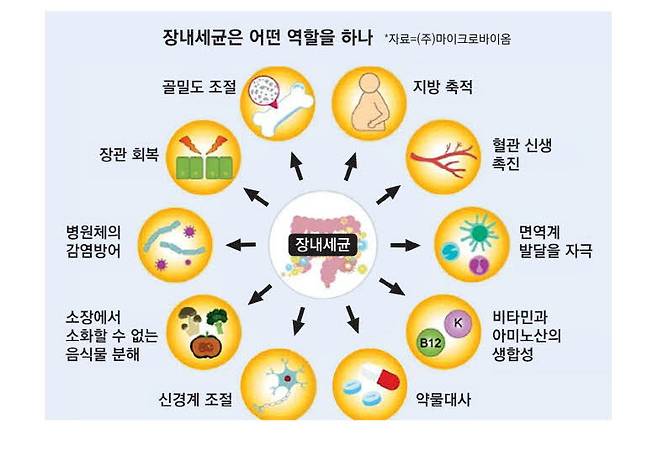 유익균은 소화를 돕고 면역기능을 향상시켜 질병을 예방해주지만, 유해균은 유해한 물질을 생산해 장내 염증을 일으키고 면역력을 떨어뜨려 각종 질병에 노출된다. 유익균에는 △락토바실러스(Lactobacillus) △비피더스균(Bifidobacterium) △아커만시아(Akkermansia) △락토코쿠스(Lactococcus) △엔테로코쿠스(Enterococcus) 등이 있으며, 유해균에는 △퍼미큐테스(Firmicutes·클로스트리디움(Clostridium)속이 95% 이상 차지) △푸소박테리움(Fusobacterium) △엔테로박터(Enterobacter) △헬리코박터균(Helicobacter pylori) 등이 있다.