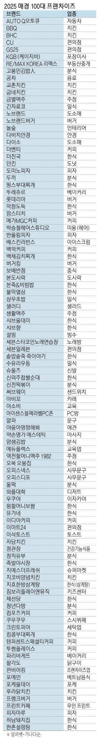 매일경제는 올해 100대 프랜차이즈를 선정하기 위해 심사위원단(임영균 광운대 명예교수, 김재욱 한국프랜차이즈학회장·고려대 교수, 이경희 한국창업전략연구소장)을 구성하고 2024년 12월까지 공정거래위원회에 등록된 프랜차이즈 브랜드 1만2300여 개를 대상으로 심사를 진행했다.