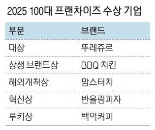 상생 브랜드상은 'BBQ 치킨', 해외개척상은 '맘스터치', 혁신상은 '반올림피자', 잠재 성장 가능성이 높은 브랜드에 수여하는 루키상은 '백억커피'가 각각 수상했다.