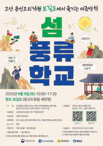 섬 풍류학교는 8월 9일 보길도 윤선도원림 세연정에서 펼쳐진다. 초등학생 이상 가족을 대상으로 윤선도 이야기를 듣고 선비 갓 만들기, 시조 짓기 등 고산 윤선도의 낙원에서 하루를 보내는 감성 체험 프로그램이다. 참가자 전원에게는 중식과 왕복 배편이나 버스비용, 기념품 등이 무료로 제공된다.