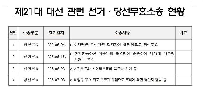 | ▲ 21대 대선 선거 쟁송표 중앙선거관리위원회가 정보 공개한 제21대 대선 관련 선거쟁송 현황표 |
