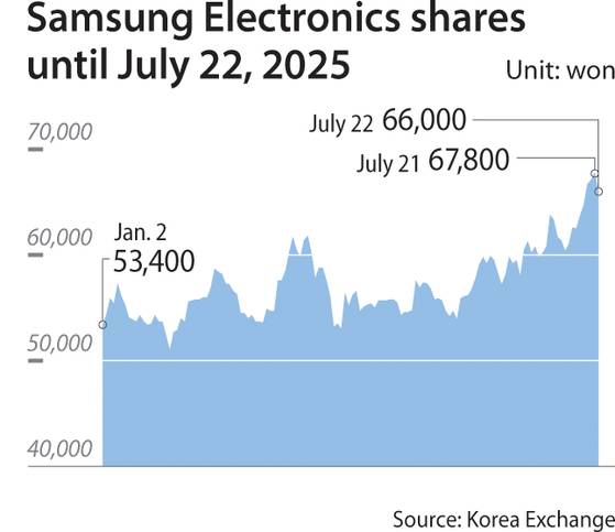 ![Samsung's flag at Samsung Town Headquarters in Seocho, southern Seoul. [YONHAP]](https://img1.daumcdn.net/thumb/R658x0.q70/?fname=https://t1.daumcdn.net/news/202507/22/koreajoongangdaily/20250722161745280tgze.jpg)