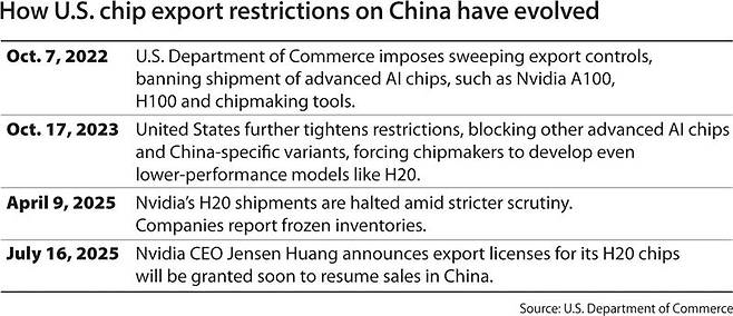 ![Nvidia CEO Jensen Huang gestures as he speaks on stage during the opening ceremony of the third China International Supply Chain Expo, in Beijing on July 16. [AP/YONHAP]](https://img2.daumcdn.net/thumb/R658x0.q70/?fname=https://t1.daumcdn.net/news/202507/22/koreajoongangdaily/20250722161746948juuz.jpg)