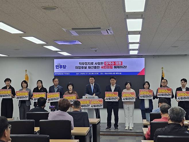성남시의회 더불어민주당협의회가 22일 기자회견을 열고 국민의힘이 전 의장 이덕수 의원을 다시 의장 후보로 선출한 결정에 대해 강력 반발했다.