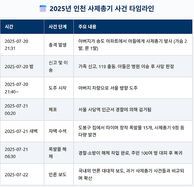 앞서 A씨는 지난 20일 오후 9시30분쯤 인천 송도국제신도시 한 아파트에서 30대 아들을 사제 총으로 쏜 뒤 도주했다. 가슴 부위에 총을 맞은 아들은 병원에 긴급이송됐으나 사망했다.