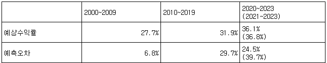 그나마도 코로나19 팬데믹의 영향으로 주가가 급등한 2020년을 제외한다면 실현수익률이 -2.9%로 떨어지고 예측오차는 39.7%로 치솟았다.