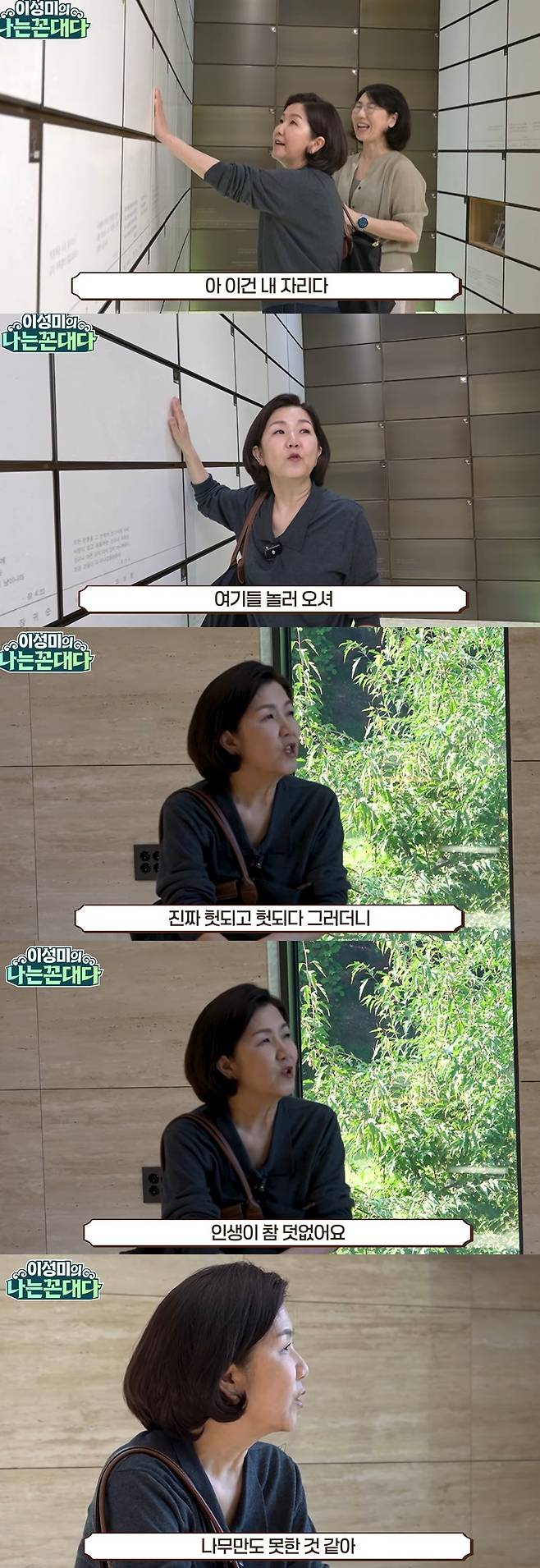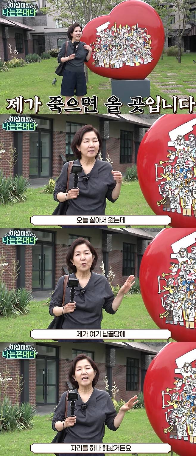 이날 이성미는 봉안당을 찾아 직접 공간을 소개했다. 그는 "여기가 바로 제가 죽으면 올 곳이다. 오늘 살아서 왔는데 제가 여기 납골당에 자리를 하나 해놨다"며 "내 죽음에 대해서 내가 먼저 준비해 놓으면 아이들이 편하겠다고 생각해서 이것저것 준비했다"고 설명했다.
