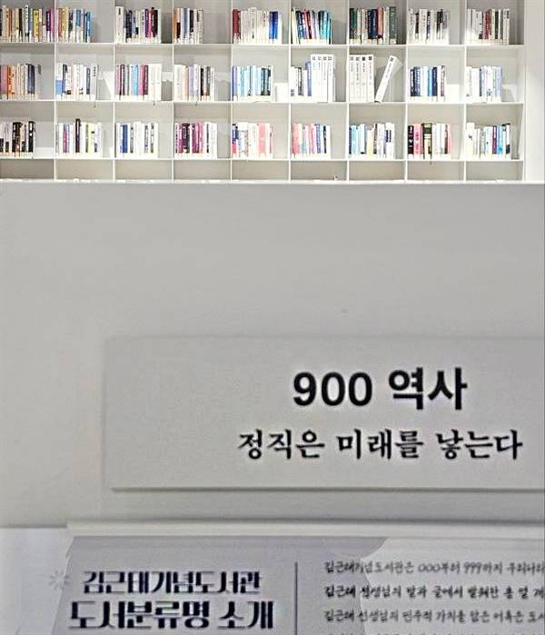 | ▲ 김근태기념도서관-곧은 길 위에 세워진 민주주의의 집 (위) 서울 도봉구 방학동에 자리한 김근태기념도서관 전경. 콘크리트의 단단한 외형과 우측에 앉은 김근태 선생의 동상이 눈에 띈다. (아래) 도서관 내부 계단 아래쪽 서가. 빼곡히 채워진 책들이 방문객을 맞이하며, 지식과 사유가 자연스럽게 흐르는 공간의 구조를 보여준다. |