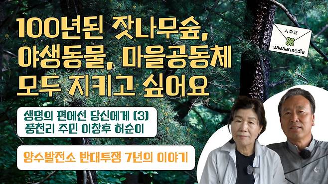 전국 곳곳에서 난개발과 반환경 정책으로 생명의 터전이 파괴되고 있습니다. 그러나 그곳마다 ‘생명의 편에 선 사람들’이 있습니다. <생명의 편에 선 당신에게>는 이들의 목소리를 기록하고, 연대하고자 하는 또 다른 당신과 연결하고자 하는 새알미디어의 연속 기획입니다. 기후·환경 위기의 최전선에서 생명을 지키는 이들의 기록. 그 세 번째는 가리산 잣나무숲과 그곳에 깃대어 사는 생명들을 지키기 위해 7년째 양수발전소 건설에 맞서 싸워온 홍천 풍천리 주민 허순이, 이창후님입니다. <기자말>