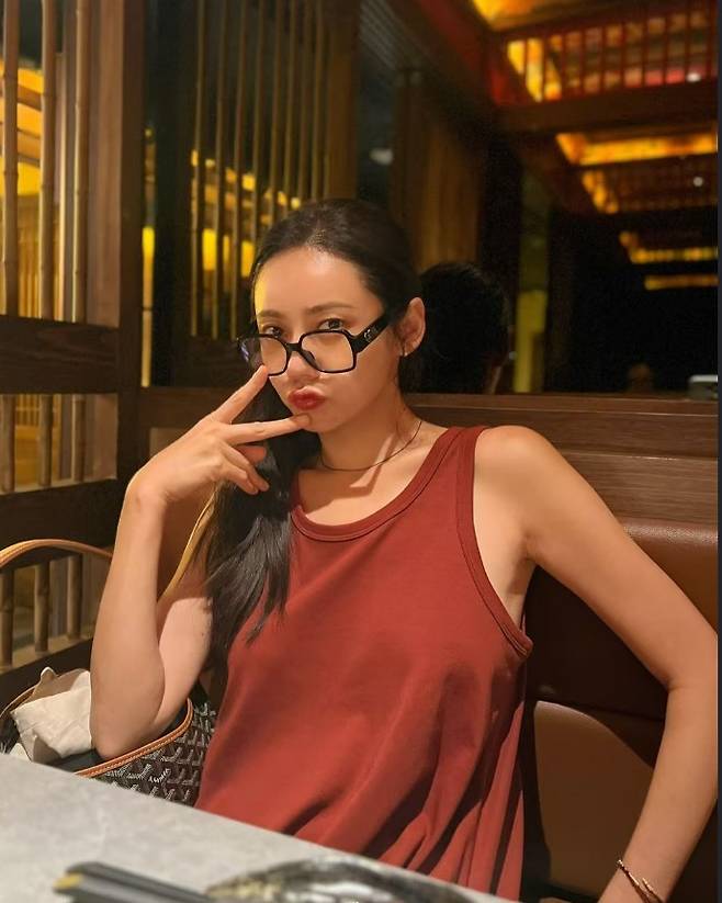 공개된 사진 속 추자현은 브릭 톤의 슬리브리스 톱을 입고 자유로운 포즈를 취하고 있다.