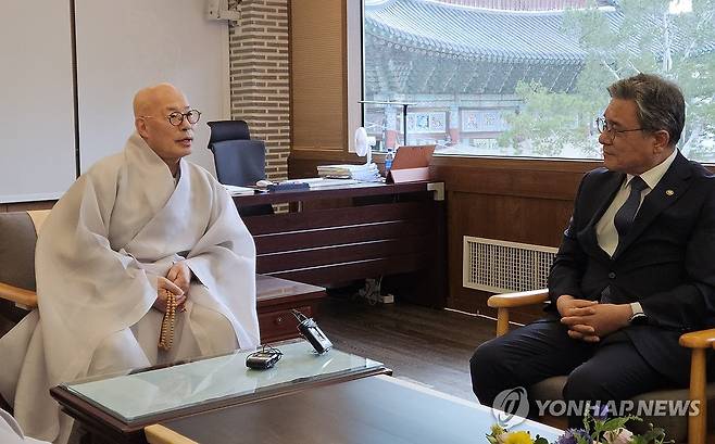 (서울=연합뉴스) 허민 국가유산청장이 22일 서울 종로구 조계종 총무원에서 대한불교조계종 총무원장 진우스님을 예방하고 있다. 2025.7.22 [국가유산청 제공. 재판매 및 DB 금지]