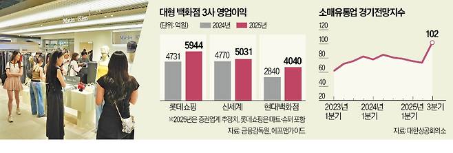백화점업계는 새 정부 출범 이후 나타난 소비심리 회복 기대로 실적 반등의 발판을 마련했다고 판단하고 있다. 대한상공회의소에 따르면 올 3분기 소매유통업 경기전망지수(RBSI)는 전 분기 대비 27포인트 급등한 102를 기록했다. RBSI가 100 이상이면 소매유통업 경기를 직전 분기보다 긍정적으로 보는 기업이 많다는 의미다. 이 수치가 100을 넘어선 것은 2021년 3분기(106) 후 4년 만이다.