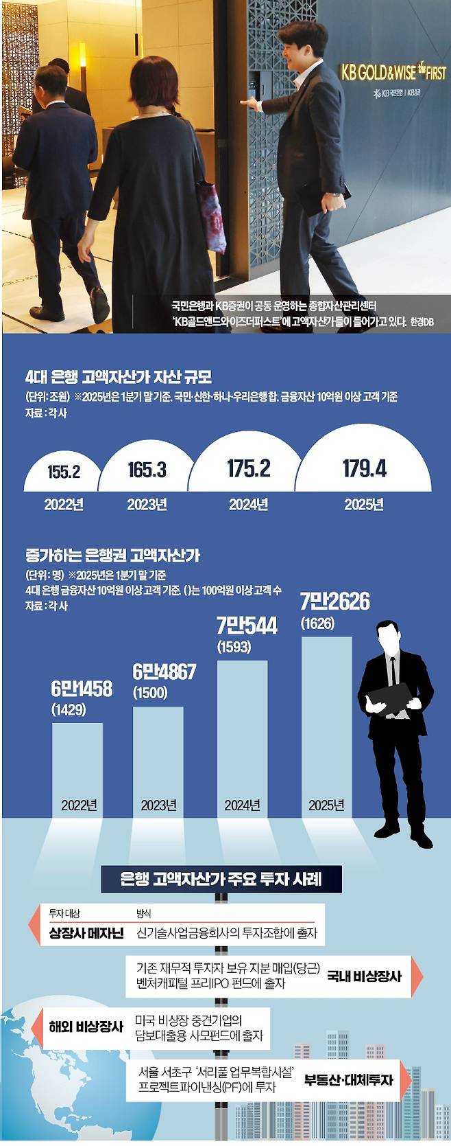 고액 자산가들이 이 같은 투자에 뛰어드는 사례는 점점 많아지고 있다. 이들은 자본시장 전반에서 기회를 훑으면서 과거 기관투자가의 전유물로 여겨지던 투자 대상에도 적극 자금을 투입한다. 은행들은 이 과정에서 각종 유망 투자처를 발 빠르게 연결해주며 존재감을 드러내고 있다. 금융자산 10억원 이상인 고액 자산가들이 국민 신한 하나 우리 등 4대 은행에 맡긴 돈이 지난 1분기 179조3595억원까지 불어난 배경이다.