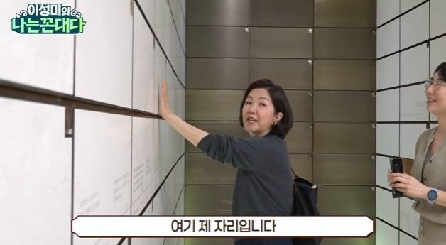 이후 이성미는 "우리집 보여드리겠다. 평수가 얼마 안 됐는데 남편하고 같은 자리다"라며 자신이 안치될 자리를 소개했다. 그는 "제가 왜 좋아하는지 알게 되실거라 그랬지 않냐. 바깥에 꽃 놓고 사진 놓고 이런게 하나도 안 보인다. 그냥 깔끔하다. 뭐가 없다. 그리고 자기가 좋아하는 말씀을 본인이 미리 예약을 해놓을수 있다. 예약해놓은시는 분도있고. 나는 여기 가겠다고 이렇게 자리를 잡아놓는다"며 "이거 내 자리다. 마이 하우스, 내 집이다. 마이 홈. 여기들 놀러오라. 옆집 사시는 분 친하게 지낼 테니까"라고 말했다.