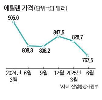 실제 에틸렌 t당 가격은 지난해 3월 905달러에서 지난달 767.5달러로 하락했다. 석유화학업계의 수익성 지표인 에틸렌 스프레드(에틸렌 가격에서 나프타 가격을 뺀 값)는 215달러로 손익분기점으로 여겨지는 250달러를 밑돌았다.