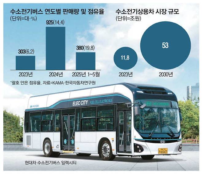 수소전기버스의 이러한 약진은 승용차 시장과 비교하면 더 두드러진다. 한국 유일의 FCEV 모델인 넥쏘는 국내 승용차 시장 판매량에서 차지하는 비중이 0.1% 수준인 데 반해 대형버스 시장에서는 FCEV가 이미 주력 모델 중 하나가 된 셈이다.