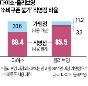 22일 업계에 따르면 올리브영의 전국 매장은 1379곳으로 이 중 소비쿠폰으로 결제할 수 있는 지점은 11.2%인 154곳에 불과하다. 모두 가맹점주가 운영하는 매장이다. 본사가 직영하는 1179곳에선 사용할 수 없다. 가맹점 중에서도 ‘연매출 30억원 이하’인 가맹점에서만 사용할 수 있다 보니 연매출 30억원 이상인 54개 가맹점에선 사용이 불가능하다. 저가형 생활용품 판매점 ‘다이소’도 비슷하다. 전국 다이소 매장 1576곳 중 소비쿠폰을 쓸 수 있는 지점은 30.6%인 483곳이다.