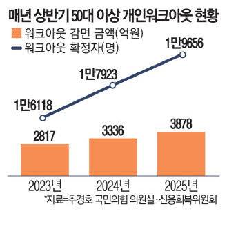 22일 국회 정무위원회 소속 추경호 국민의힘 의원이 신용회복위원회(신복위)에서 제출받은 자료에 따르면 올해 상반기 신복위에 개인워크아웃을 신청해 원금 감면이 확정된 인원은 4만7750명으로 역대 최다를 기록했다. 이 중 50대 이상 장·노년층의 개인워크아웃이 크게 늘었다. 50대 이상 연령대에서 워크아웃이 확정된 사람은 1만9656명이었다. 이 중 50대는 1만1633명, 60대 이상은 8023명이었다. 모두 역대 가장 많은 숫자를 기록한 것이다. 2024년 대비 증가율로 보면 60대 이상 워크아웃 확정자가 13.1% 늘어 전 연령대에서 유일하게 두 자릿수 증가율을 기록했다.