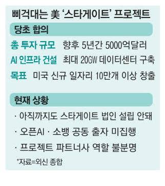프로젝트 주요 투자사인 오픈AI와 일본 소프트뱅크 간 이견으로 6개월이 지나도록 사업 법인조차 설립되지 못하면서 약속한 출자금 집행도 이뤄지지 않고 있다.