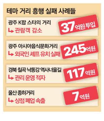 테마 거리 사업의 가장 큰 문제는 '외형만 만들고 끝나는 사업'이라는 점이다. 광주 동구는 이미 'K팝 스타의 거리'와 '아시아음식문화거리'를 조성했지만, 두 곳 모두 기대했던 상권 활성화 효과를 내지 못하고 사실상 유령 거리로 전락했다. K팝 스타의 거리는 광주 출신 K팝 스타를 테마로 충장로 옛 학생회관 뒷골목과 금남로4가역 주변에 조성됐다. 2018년부터 올해까지 총 사업비 37억원을 투입했지만, 현재는 관람객이 거의 없고 쓰레기만 나뒹굴고 있다. 아시아음식문화거리도 마찬가지다. 이곳은 245억원을 들여 조성했지만 정작 아시아 음식점은 찾아보기 힘들다.