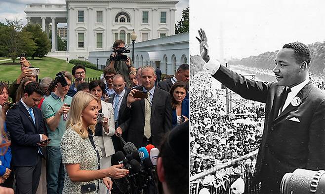 | 새 사실 밝혀질까 캐럴라인 레빗 백악관 대변인(가운데)이 21일(현지시간) 미국 워싱턴 백악관 서쪽 별관 인근에서 최근 현안과 관련한 취재진의 질문에 답하고 있다.(왼쪽사진) 오른쪽 사진은 이날 도널드 트럼프 행정부가 연방수사국(FBI)의 감시 기록을 공개한 흑인 인권운동가 마틴 루서 킹 주니어 목사의 생전 모습. 워싱턴=로이터연합뉴스·세계일보 자료사진 |