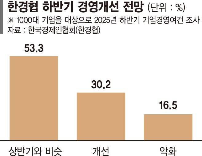 22일 한국경제인협회(한경협)가 1000대 기업을 대상으로 '2025년 하반기 기업경영여건 조사'를 실시한 결과 하반기에는 기업 경영여건이 올해 상반기에 비해 '개선'될 것이라는 응답 비중(30.2%)이 '악화'될 것이라는 응답(16.5%)에 비해 두 배 가까이 높은 것으로 나타났다. 응답기업의 절반(53.3%)은 하반기 경영여건이 상반기와 비슷할 것이라고 전망했다. 하반기 경영여건을 '악화'로 전망한 기업들조차 절반 가까운 40%는 개선 시점을 내년 1·4분기로 예상, '경기가 바닥을 찍었다'는 낙관론에 힘이 실리고 있다.