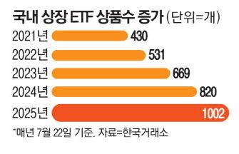 국내에 상장된 ETF의 수는 1년 전(820개)보다 22.2%, 2년 전(669개)보다 50%, 3년 전(531개)보다 89% 늘어났다.