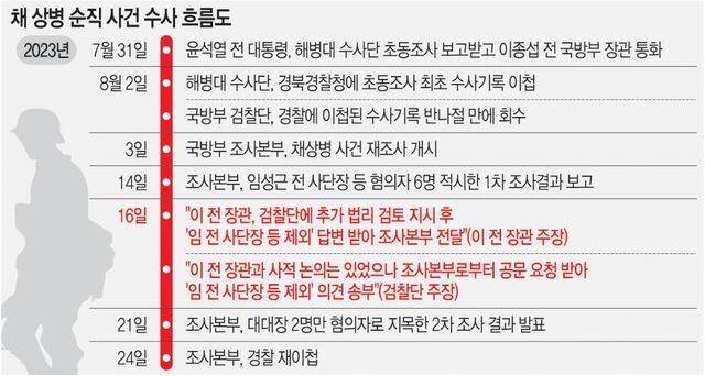 22일 이 전 장관이 채상병 특검(특별검사 이명현)에 제출한 의견서와 이 전 장관 측 설명을 종합하면 이 전 장관은 2023년 7월 임 전 사단장에게 채상병 사건의 업무상 과실치사 혐의가 있다는 해병대 수사단 조사 결과를 보고받았다. 그러자 이번엔 조사본부에 재조사를 지시했지만 다음 달 14일 조사본부로부터도 임 전 사단장을 포함한 6명에게 혐의가 있다는 보고를 받는다.