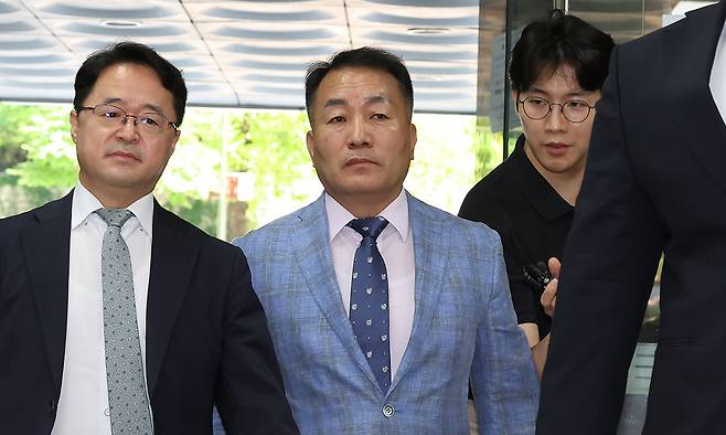 | 구속영장 심사 출석하는 김 前 사령관 채해병 사망 사건과 관련해 윤석열 전 대통령 격노설에 대한 위증 혐의를 받는 김계환 전 해병대사령관(왼쪽 두번째)이 22일 서울중앙지방법원에서 열린 구속 전 피의자 심문에 출석하고 있다. 뉴스1 |