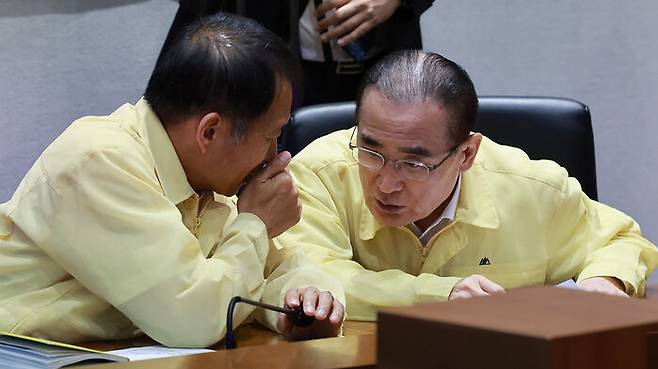 ▲ 위성락 국가안보실장(오른쪽)과 송기호 국정상황실장이 지난 18일 정부서울청사 중앙재난안전상황실에서 열린 집중호우 대처 상황점검회의에서 대화하고 있다.