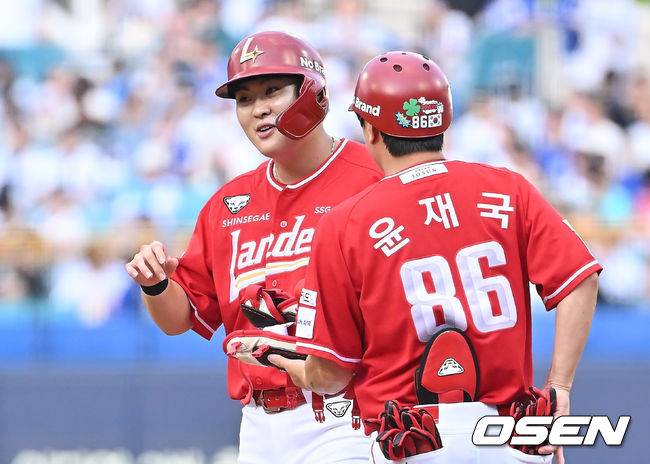 SSG 랜더스 고명준이 1회초 1사 만루 유격수 앞 1타점 안타를 치고 기뻐하고 있다. 2025.07.22 / foto0307@osen.co.kr