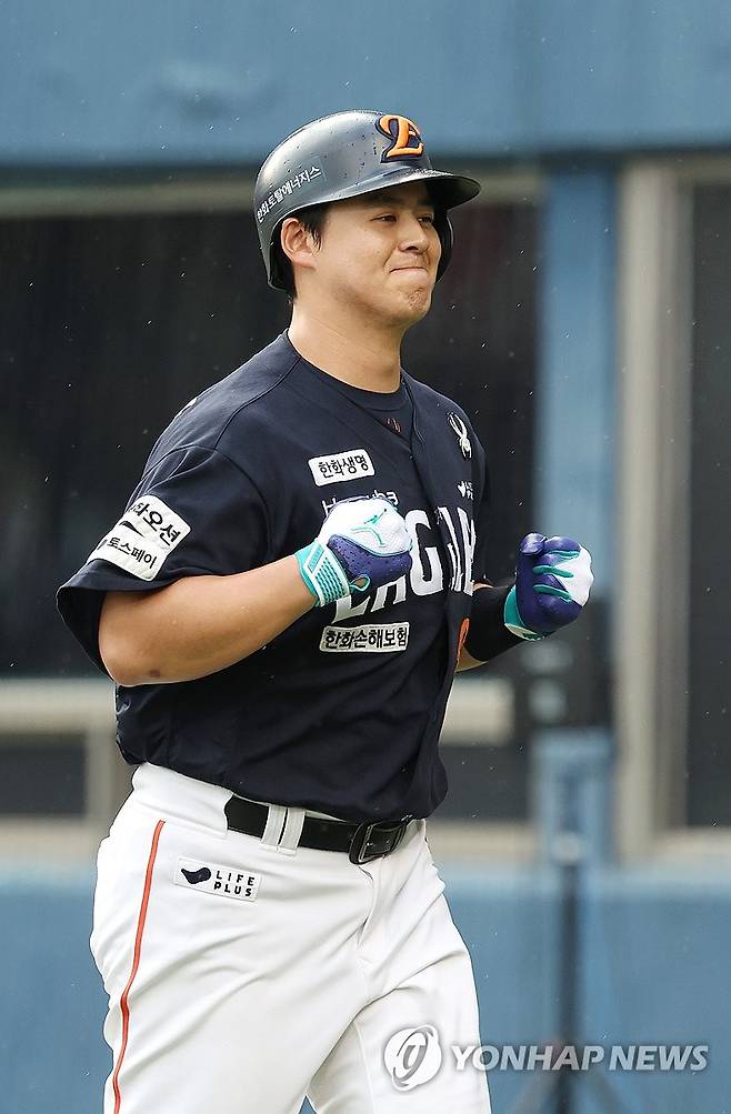 (서울=연합뉴스) 김주형 기자 = 22일 서울 잠실야구장에서 열린 프로야구 2025 신한 SOL 뱅크 KBO리그 두산베어스와 한화이글스 경기, 2회초 무사 한화이글스 노시환이 솔로 홈런을 친 뒤 더그아웃으로 향하고 있다. 2025.7.22