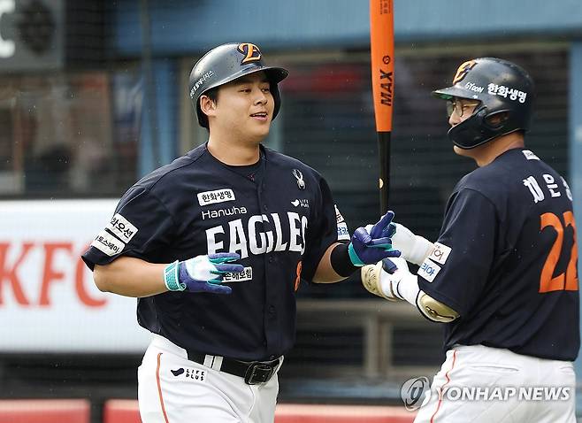 (서울=연합뉴스) 김주형 기자 = 22일 서울 잠실야구장에서 열린 프로야구 2025 신한 SOL 뱅크 KBO리그 두산베어스와 한화이글스 경기, 2회초 무사 한화이글스 노시환이 솔로 홈런을 친 뒤 더그아웃으로 향하고 있다. 2025.7.22