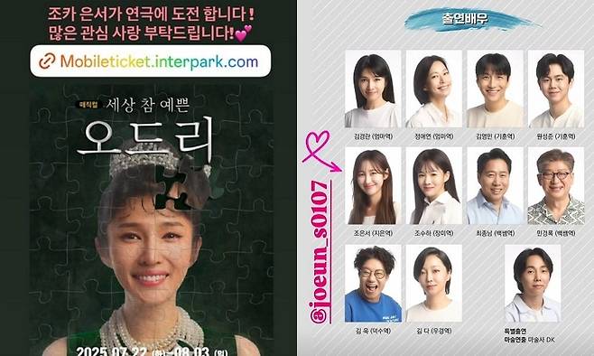 사진에는 송가인의 조카 조은서가 출연하는 연극 '세상 참 예쁜 오드리'의 포스터와 작품 정보, 출연 배우 라인업, 캐스팅 일정 등이 담겨 있다.
