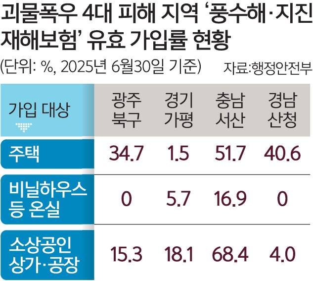 이번 집중호우 피해가 큰 광주 북구와 가평, 산청, 서산 지역의 지난달 말 기준 풍수해·지진재해보험 유효 가입 현황을 보면, 시설별 가입률이 주택 29.9%, 소상공인 시설 20.9%, 온실은 6.5%에 불과하다.