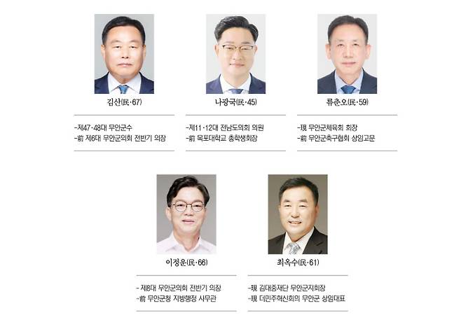 내년 6월 제9회 전국동시지방선거를 앞두고 전남 무안에선 현역인 김산 군수에 맞서 더불어민주당 소속의 여러 입지자들이 김 군수의 3선 가도에 제동을 걸 수 있을지 관심이 쏠린다. 4년 전 선거에서 무소속으로 출마했던 김 군수에 맞서 더불어민주당 후보로 나섰던 최옥수 전 무안군산림조합장을 비롯해 나광국 전남도의회 의원, 이정운 전 무안군의회 의장, 류춘오 무안군체육회장이 자천타천 대항마로 꼽힌다.