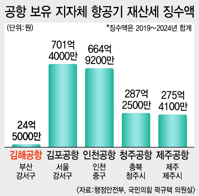 부산 세제혜택 부족은 항공기 재산세 수입을 줄이는 결과를 낳았다. 국민의힘 곽규택(부산 서동) 의원이 행정안전부로부터 제출받은 ‘지자체별 항공기 보유세(재산세) 현황’에 따르면 2019년 이후 5년간 청주공항의 항공기 재산세 징수액은 총 287억 원인 반면 부산 강서구는 24억 원에 그쳤다. 곽 의원은 “항공기 등록이 공항 활성화의 출발점이라는 것을 감안할 때, 부산 강서구의 등록 항공기만 유독 감소하는 문제에 대한 해결 방안을 해당 지자체가 적극 강구할 필요가 있다”고 지적했다.