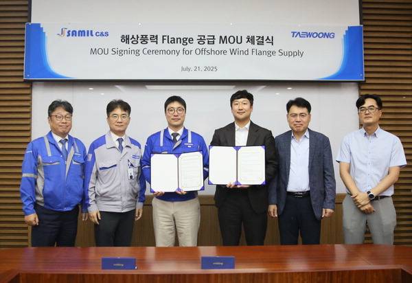 태웅은 해상풍력 발전기 아래를 지탱하는 구조물 제작 업체 ㈜삼일씨엔에스와 해상풍력발전 플랜지(풍력발전기 몸통 이음쇠) 공급 양해각서(MOU)를 체결(사진)했다고 22일 밝혔다.
