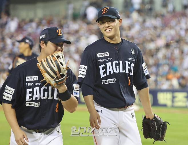 5회말까지 무실점으로 호투한 문동주가 이닝을 마치고 노시환과 웃으며 마운드를 내려오고 있다.