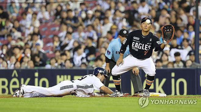 (서울=연합뉴스) 김주형 기자 = 22일 서울 잠실야구장에서 열린 프로야구 2025 신한 SOL 뱅크 KBO리그 두산베어스와 한화이글스 경기, 5회말 2사 1루 두산 정수빈 타석때 1루 주자 이유찬이 한화 투수 문동주의 견제구에 슬라이딩 하고 있다. 2025.7.22