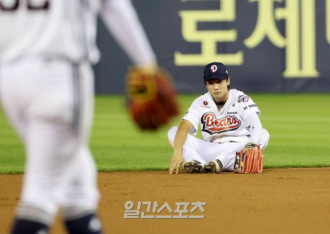 6회초 1사 1루 채은성의 땅볼 타구를 처리하다 놓쳐 주자를 모두 진루시킨 유격수 이유찬이 허탈해 하고 있다.