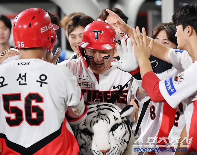 22일 광주 기아 챔피언스필드에서 열린 LG-KIA전. 6회말 무사 최형우가 솔로포를 친 후 환영받고 있다. 광주=정재근 기자 cjg@sportschosun.com/2025.7.22/