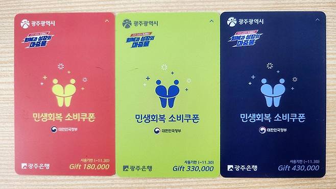 <속보>광주시가 민생회복 소비쿠폰 선불카드 색상을 지급 금액 별로 구분한 것으로 나타나 취약계층을 중심으로 비난이 쏟아지고 있다.<사진>