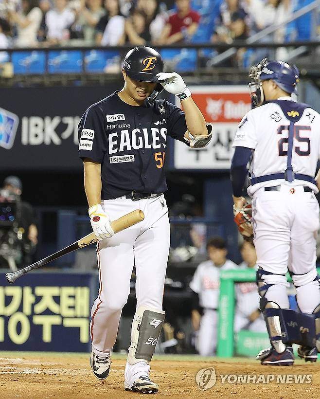 (서울=연합뉴스) 김주형 기자 = 22일 서울 잠실야구장에서 열린 프로야구 2025 신한 SOL 뱅크 KBO리그 두산베어스와 한화이글스 경기, 8회초 2사 주자 만루 상황에서 삼진 아웃된 한화 이원석이 아쉬운 표정으로 더그아웃으로 향하고 있다. 2025.7.22
