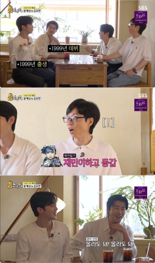 99년생이라는 김요한을 두고 윤계상은 "재민이랑 동갑"이라고 밝히며 과거 '육아일기'의 재민이를 언급했다.