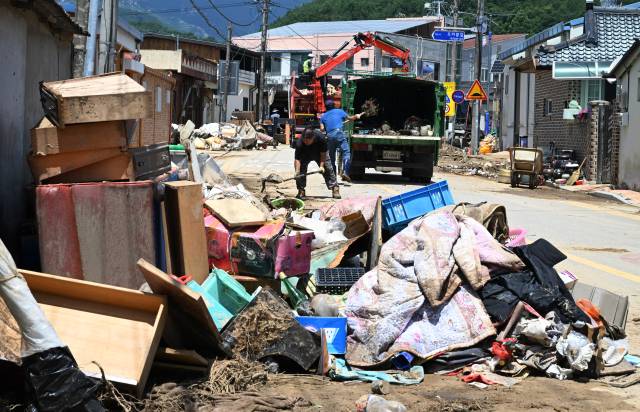 이날 면사무소 인근은 온통 흙과 쓰레기로 가득했다. 주민과 자원봉사자 등이 집과 상가마다 가구와 집기를 내놓고 집 내부와 입구에 쌓인 흙과 쓰레기를 연신 퍼내고 있었다. 하순자(70)씨 집도 같은 상황이다. 바로 옆에서 운영하던 슈퍼마켓도 모두 침수돼 팔아야 할 상품은 물론 냉장고도 버려야 할 형편이다. 하씨는 “집도 문제지만 음료수고 뭐고 밀봉됐다고 생각한 상품도 흙먼지가 들어가서 다 버려야 하는 상황”이라며 “에어컨도 냉장고도 모두 고장 나서 앞으로가 걱정”이라고 울상을 지었다.
