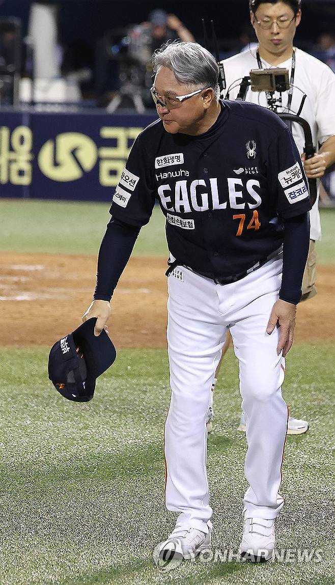 (서울=연합뉴스) 김주형 기자 = 22일 서울 잠실야구장에서 열린 프로야구 2025 신한 SOL 뱅크 KBO리그 두산베어스와 한화이글스 경기에서 10연승을 달성한 한화이글스 김경문 감독이 관중들에게 인사하고 있다.