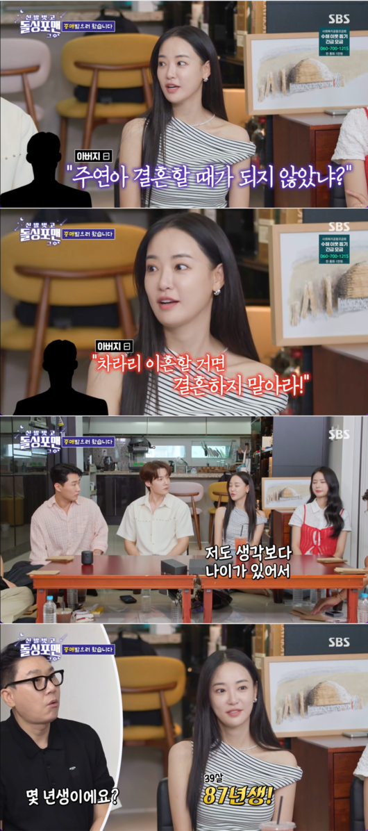 결혼을 망설이는 이유가 아빠 때문이라는 이주연은 "몇 년 전만 해도 '결혼할 때가 되지 않았냐'고 하셨는데, 이제는 '차라리 이혼할거면 하지 말아라'(하셨다)"라고 밝혀 돌싱포맨을 당황하게 만들었다.