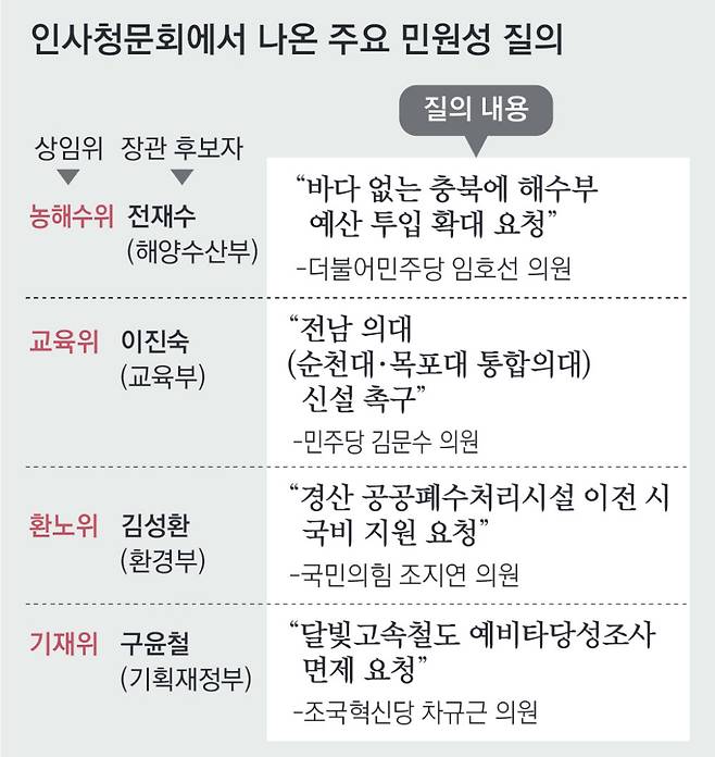 더불어민주당 임호선 의원(충북 증평-진천-음성)은 전재수 해양수산부 장관 후보자 청문회에서 “민물 낚시하는 분들이 가장 많이 찾는 곳이 충북임을 꼭 잊지 말고 챙겨 달라”며 예산 지원을 요구했다. 같은 당 김영진 의원(경기 수원병)은 구윤철 경제부총리 겸 기획재정부 장관 후보자에게 지역구를 지나는 GTX 노선 사업 진척을 요청했다. 국민의힘 조지연 의원(경북 경산)은 김성환 환경부 장관 후보자에게 지역구와 연관된 폐수처리시설 이전을 꺼냈고, 조국혁신당 차규근 의원(비례)은 자신이 시당위원장인 대구로 연결되는 고속도로 사업의 예비타당성 조사 면제를 구 후보자에게 대놓고 부탁했다.
