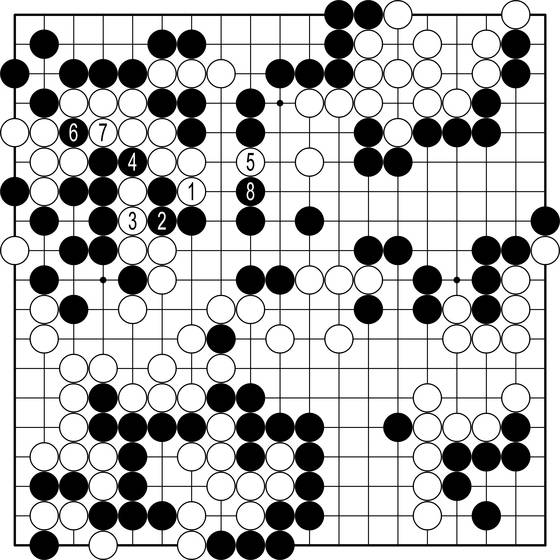 ◆실전 진행=실전부터 본다. 백1로 단수하고 3에 잇자 흑4로 끊는다. 이것으로 백 대마는 살아갈 길이 없다. 백5로 연결하고자 했으나 6에 이어 8의 한방으로 끊어졌다. 신진서는 여기서 돌을 거두었다. 홀로 남은 신진서의 부담이 그만큼 컸다. 그게 착각을 불렀다는 느낌이다. 아쉽게도 신진서를 마지막으로 한국 기사는 모두 탈락했다.